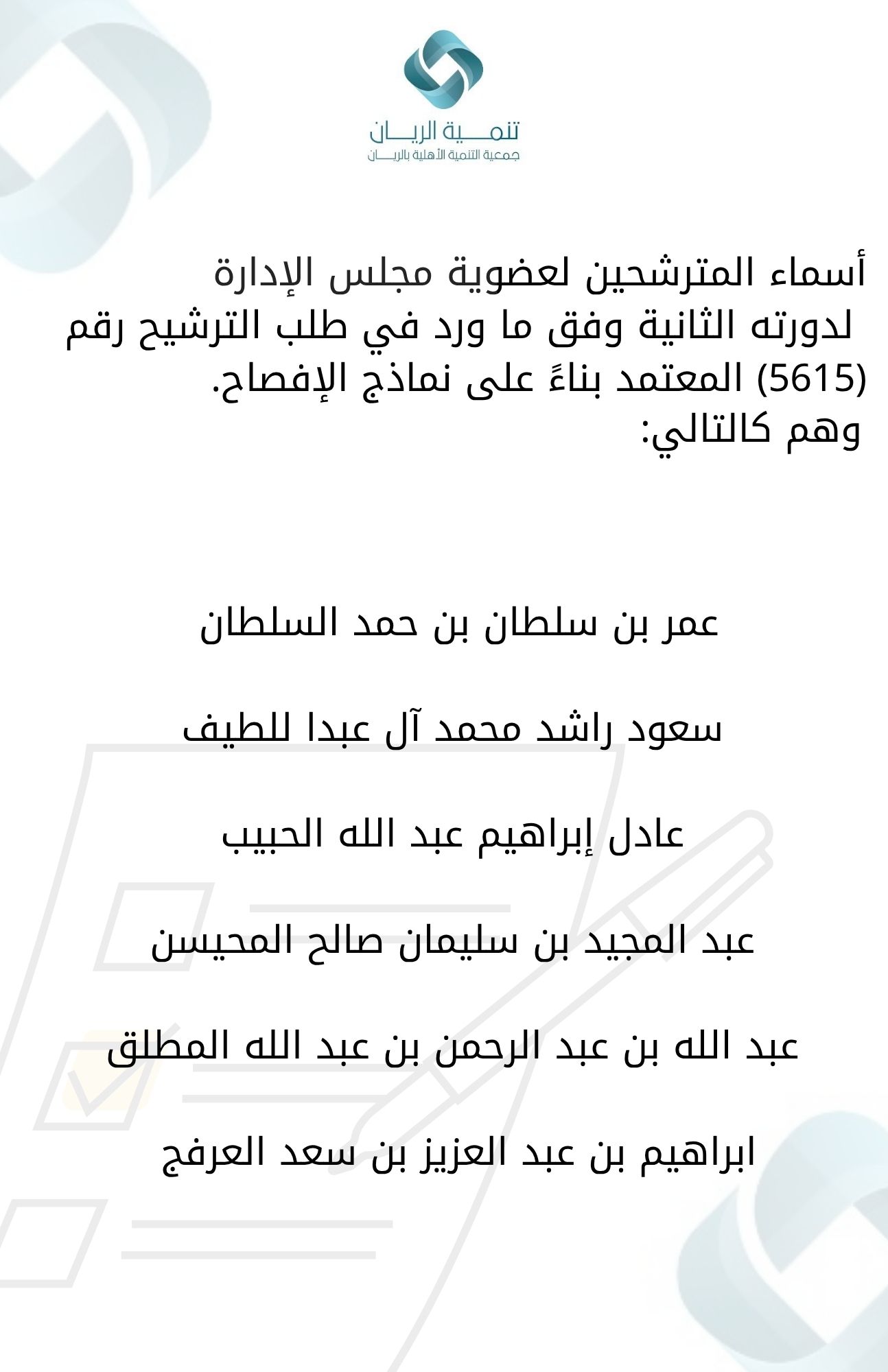 أعلنت جمعية التنمية الأهلية بحي الريان عن أسماء المرشحين لعضوية مجلس الإدارة لدورته الثانية، وذلك وفقًا لما ورد في طلبات الترشيح رقم (5615) المعتمدة، وبناءً على نماذج الإفصاح المعتمدة من الجهات المختصة.